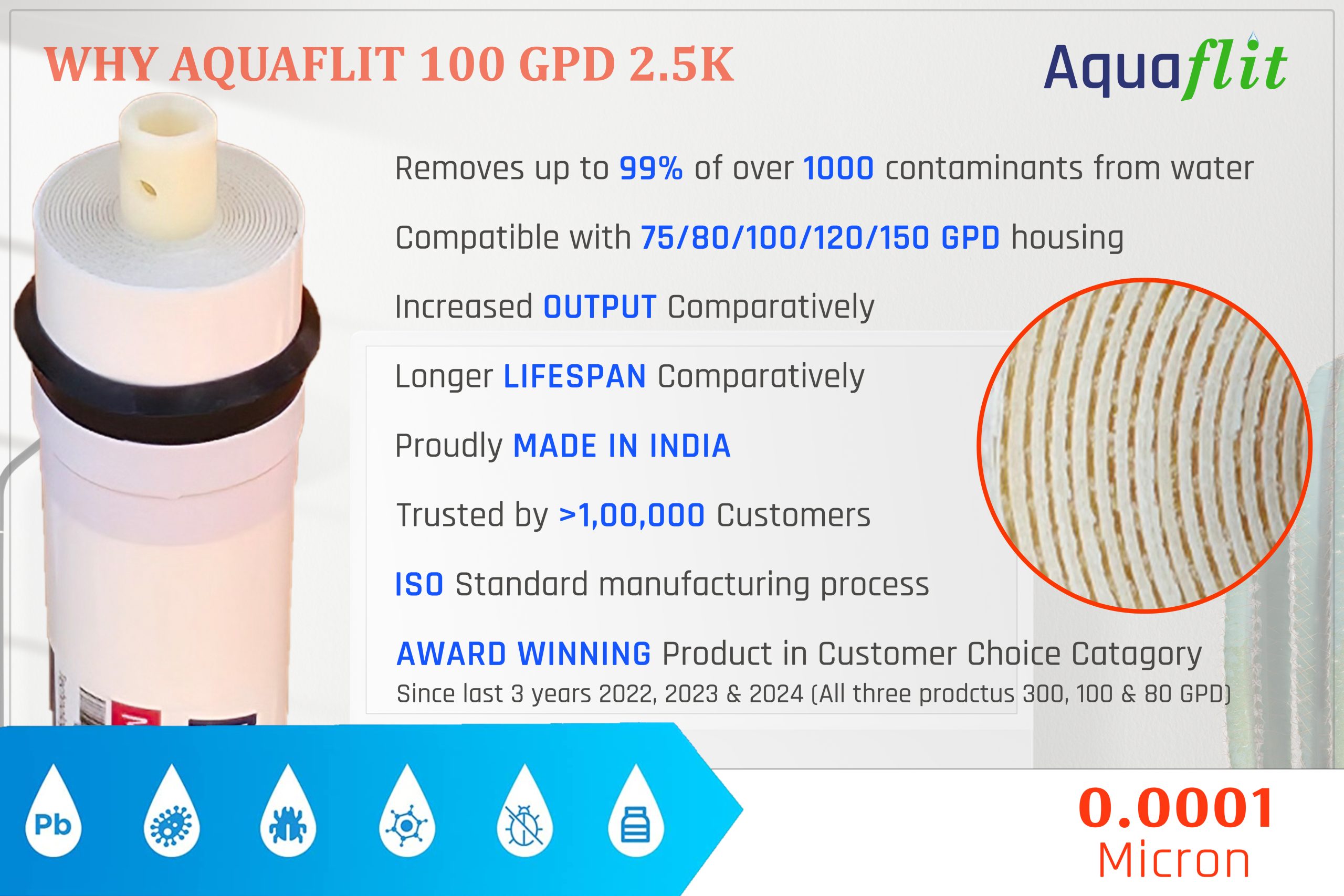 Note: Use input water below 2500 TDS level for this product for the best result. For more TDS you can use higher TDS membrane of Aquaflit.